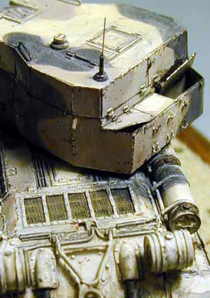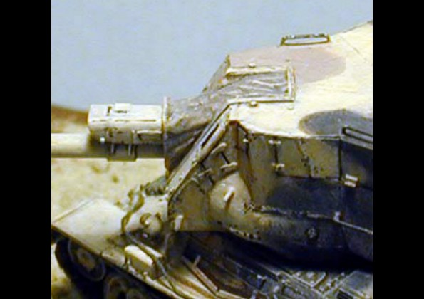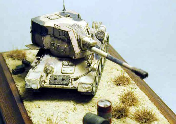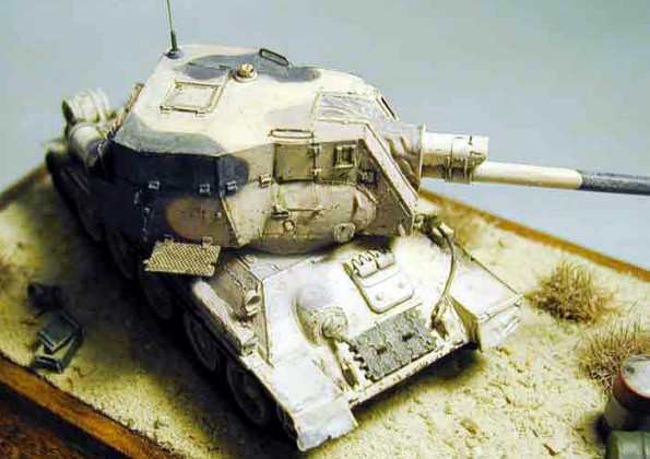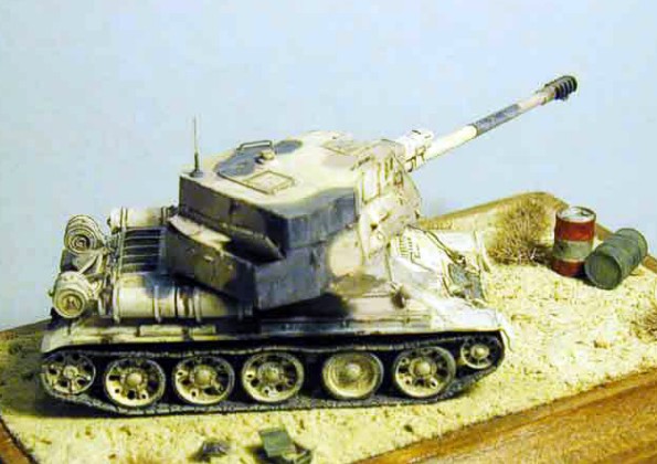 Měřítko: 1/72 Použitá stavebnice: AER-Toga Model od AER-Toga. Resinová věž byla upravena pomocí nových předělaných postranic, otevřené zadní úložné bedny, poklopů a štítu kanónu. Hlaveň a úsťovou brzdu jsem vyrobil sám ze soustružené hliníkové kulatiny. Trup a pásy jsou z modelu T-34 od ESCI, pojezdová kola jsou od Eastern Express a z modelu T-62 od ESCI. |