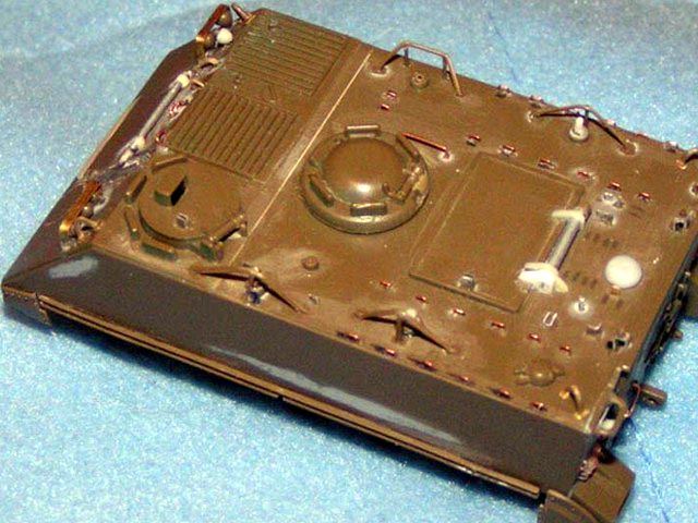 Měřítko: 1/72 Výrobce stavebnice: Italeri (ex-ESCI) Jednoduchý model, místy až příliš. V krabici Italeri najdeme ex ESCI výlisky a tedy i detailnost odpovídá době vzniku modelu. Měkký zelený plast se dobře opracovává. Překvapily velice hezky udělané pásy které bohužel postrádají vodící trn uprostřed. Pojezdová kola mne naopak zklamala, neboť jsou udělána vcelku, což jsem nemohl překousnou a musel tudíž vyrobit 10 vnitřních kol.